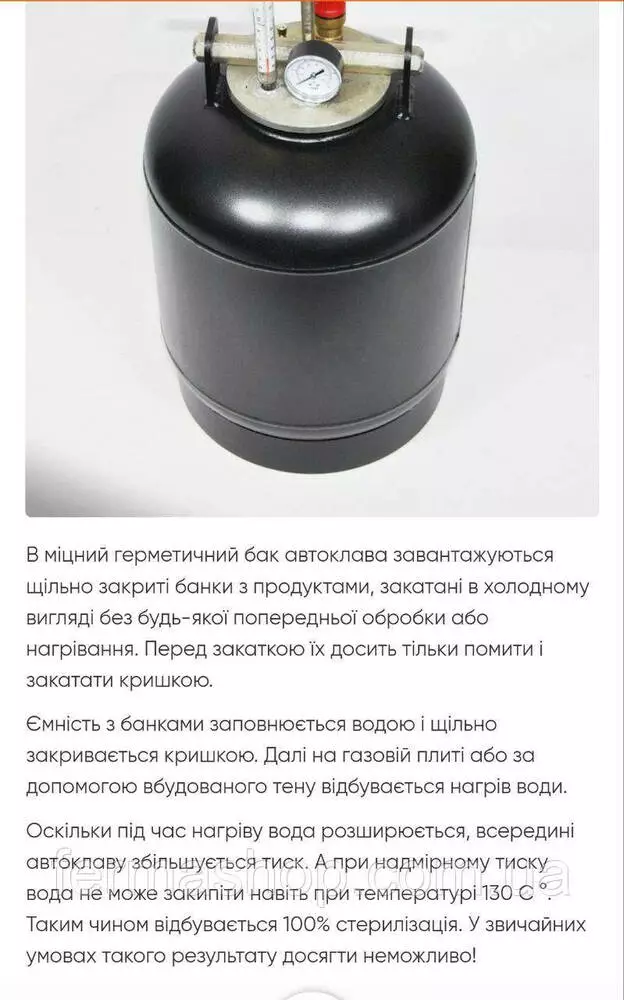 Автоклав предназначен для работы в домашних условиях, как стерилизатор пищевых продуктов для стерилизации и консервирования мяса, птицы, рыбы, овощей, фруктов, соков, компотов, паштетов и других продуктов в натуральном соку без применения консервантов, расфасованных и укупоренных сырыми в стеклянные банки.