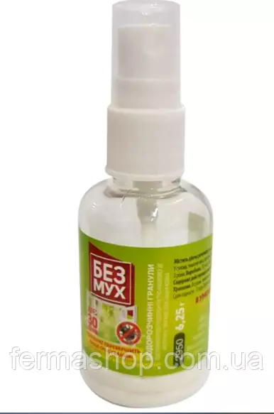 Для приготовления рабочей суспензии БЕЗ МУХ в емкости опрыскивающего устройства при тщательном перемешивании растворяют инсектицидное средство из расчета 25 г гранул на 200 мл воды комнатной температуры. Объема приготовленной суспензии достаточно для обработки поверхностей закрытого помещения площадью пола 10 м2 или поверхностей закрытого помещения площадью пола 30 м2 (так, как обрабатывается 30% площади помещения). Дезинсекцию проводят ветеринарные специалисты или лица, обученные безопасно работать с инсектицидными средствами, путем выборочного опрыскивания рабочей суспензией БЕЗ МУХ не менее 30% поверхности стен и потолка помещения. Полоски нанесения БЕЗ МУХ не должны превышать 10 х 30 см. Для уничтожения мух и тараканов достаточно применения БЕЗ МУХ только в местах сильного скопления насекомых. Опрыскивают поверхности желаемых насекомыми (теплые солнечные стены, оконные рамы, подоконники, двери, опоры, части заборов, трубы, молокопроводы, плафоны светильников и другие поверхности). Стены в свинарниках возделывают на высоте выше 1,5 м, на фермах для крупного рогатого скота – на высоте выше 2 м от пола.