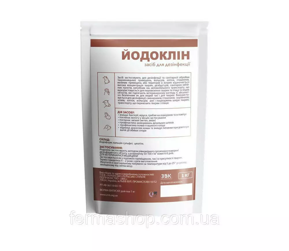 “Йодоклин®” – препарат для сухой дезинфекции на основе йодоформа, который применяют для дезинфекции и санитарной обработки животноводческих помещений.Применяется в присутствии животных и является абсолютно безопасным, как для людей так и для животных, поскольку в состав препарата входят минеральные сорбенты, соединения железа, кремния, кальция.
