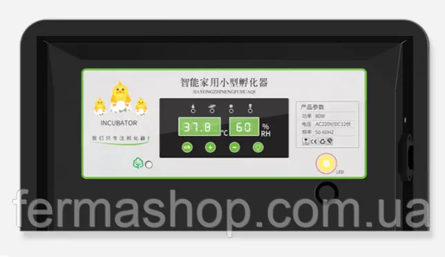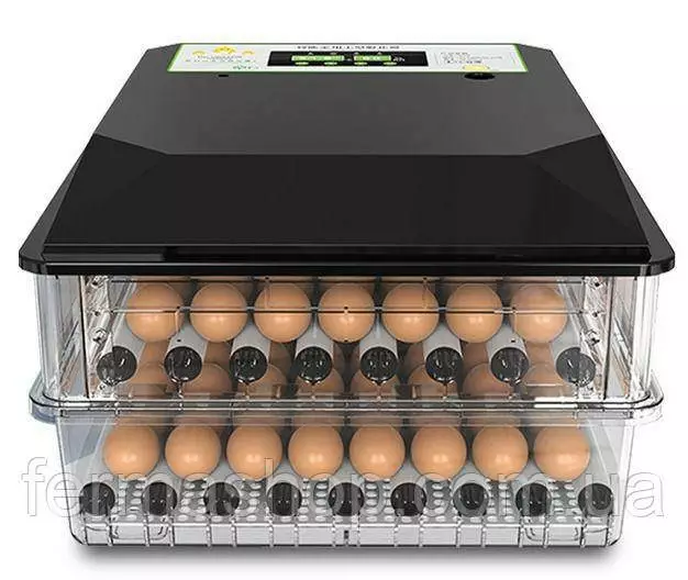 Средняя вместимость яиц: куриных - 128 шт., гусиных - 64 шт., утиных - 96 шт., перепелиных - 176 шт., индюшиных - 96 шт.ЖК-экран для контроля температуры.