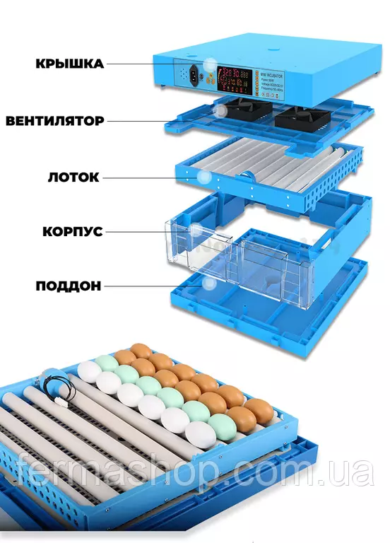 Средняя вместимость яиц: куриных - 180 шт., гусиных - 96 шт., утиных - 144 шт., перепелиных - 264 шт., индюшиных - 144 шт