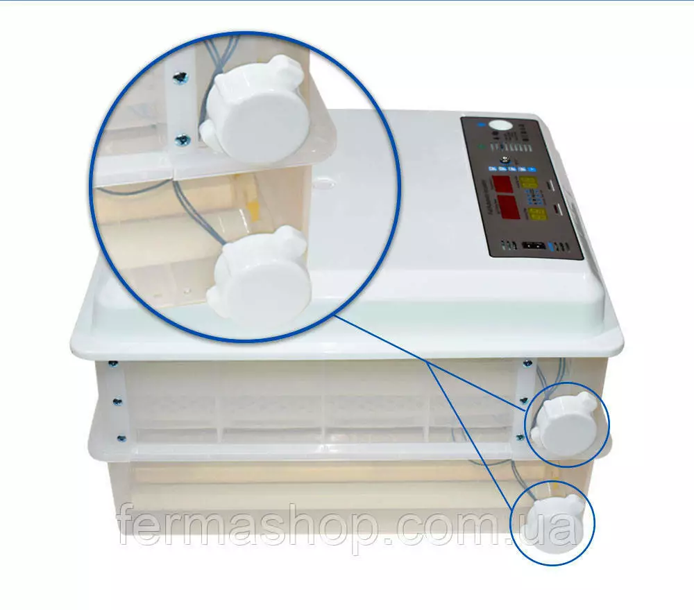 - Дополнительные функции: внешние отсеки для добавления воды, вентиляционная система, сигналы о завершении инкубации, предупреждаюший сигнал при достижении низкой влажности, овоскоп.