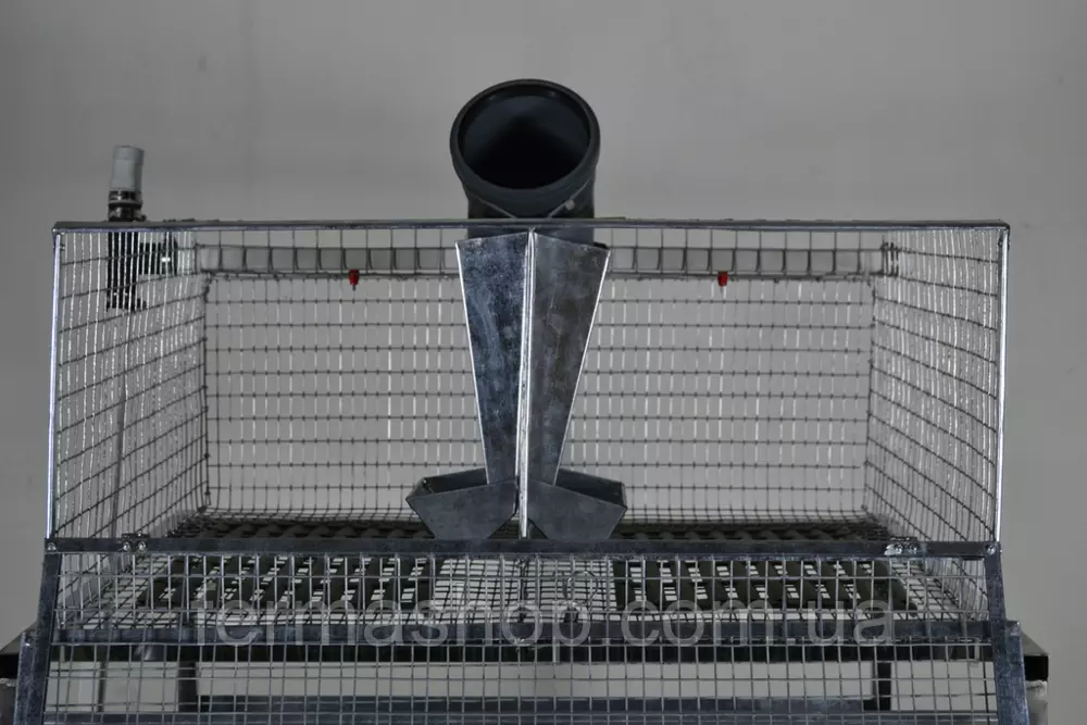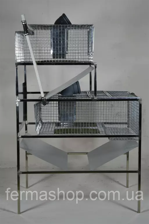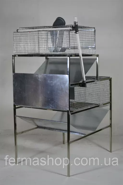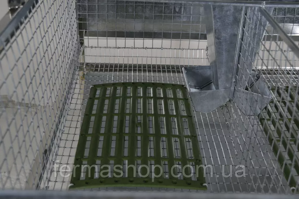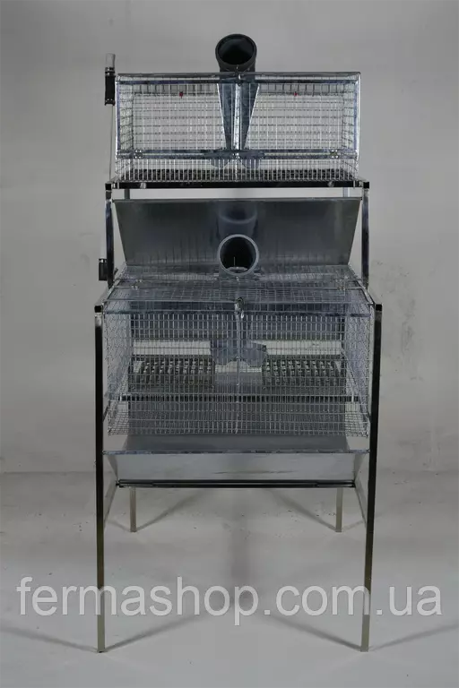 Предназначена для следующего цикла: ожидание окрола беременной самки, окрол, лактация самкой маленьких кроликов, содержание кроликов на откорме до продажи после отсадки самки. Изготовлена с оцинкованной проволоки толщиной 1.8 мм, размер ячейки 25х25 мм верх и боки, низ – 25х12 мм. По торцам двери обрамлены жестяным профилем для придания жёсткости и безопасности.
