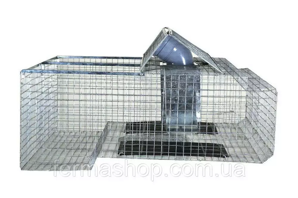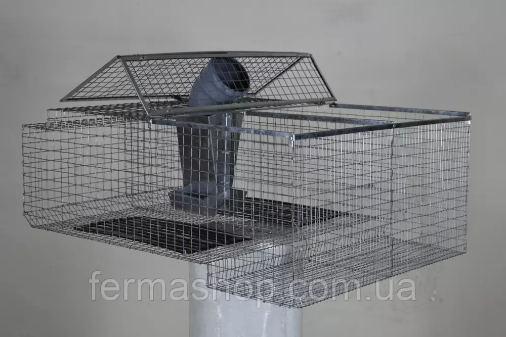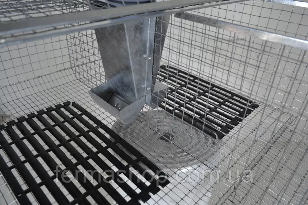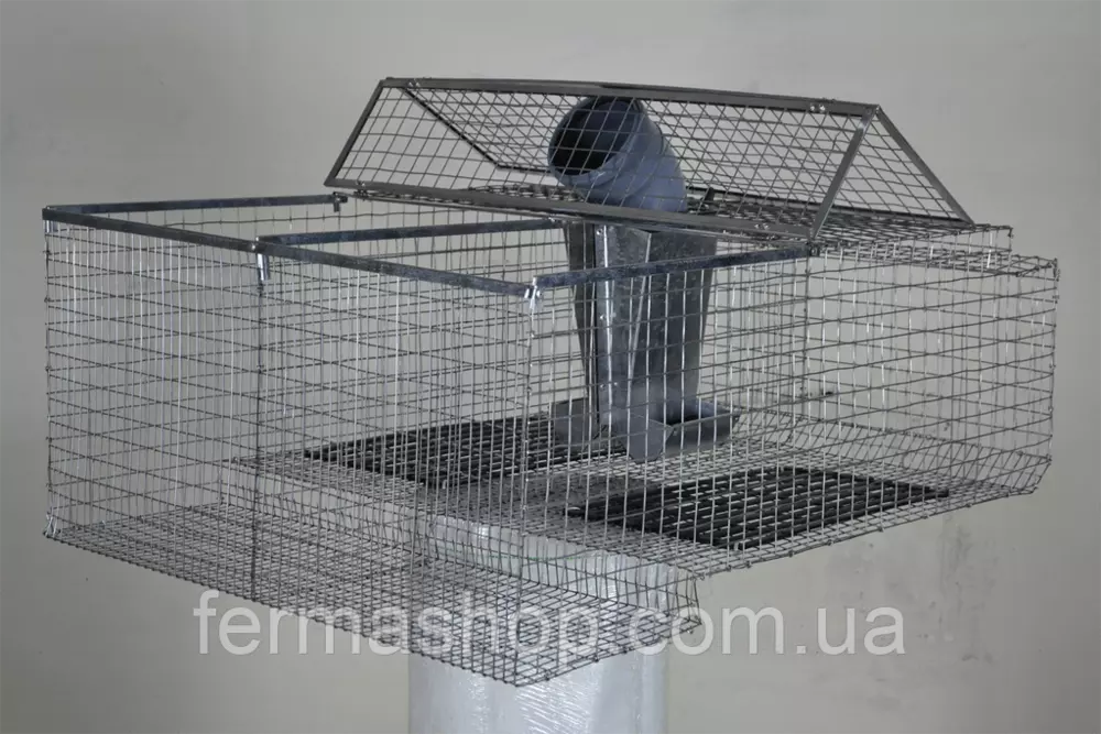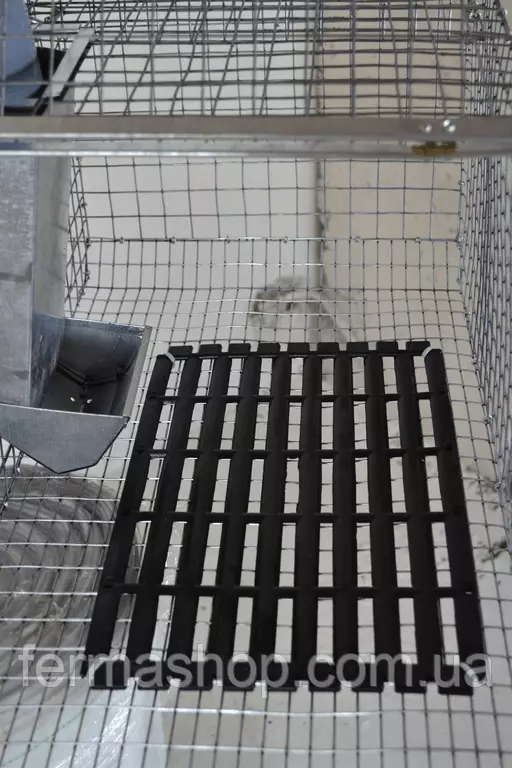 Предназначена для следующего цикла: ожидание окрола беременной самки, окрол, лактация самкой маленьких кроликов, содержание кроликов на откорме до продажи после отсадки самки. Изготовлена с проволоки толщиной 1.8 мм, размер ячейки 25х25 мм верх и боки, низ – 25х12 мм. По торцам двери обрамлены жестяным профилем для придания жёсткости и безопасности.