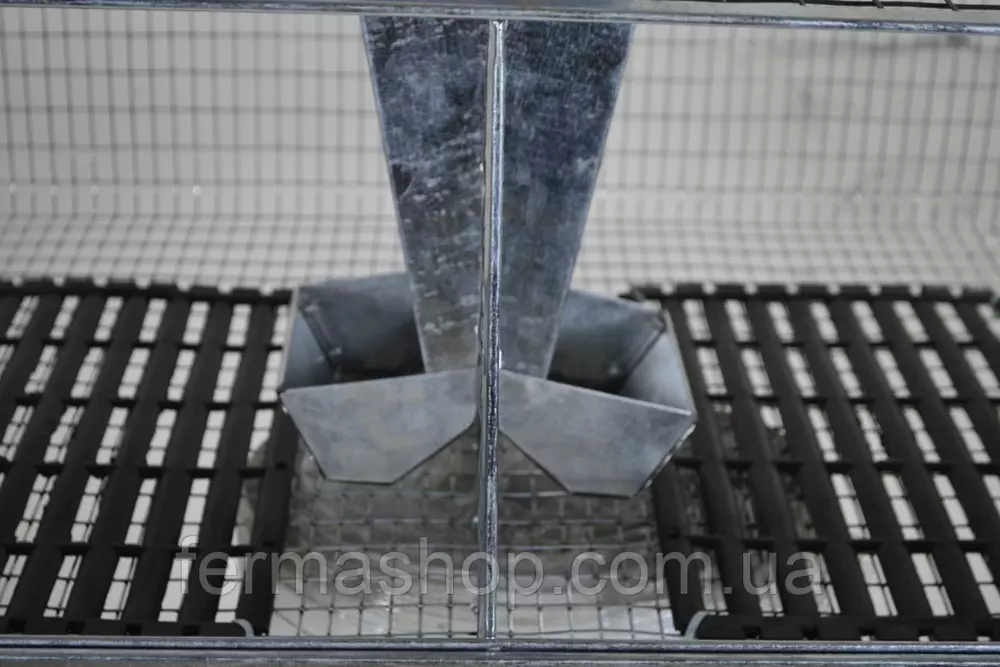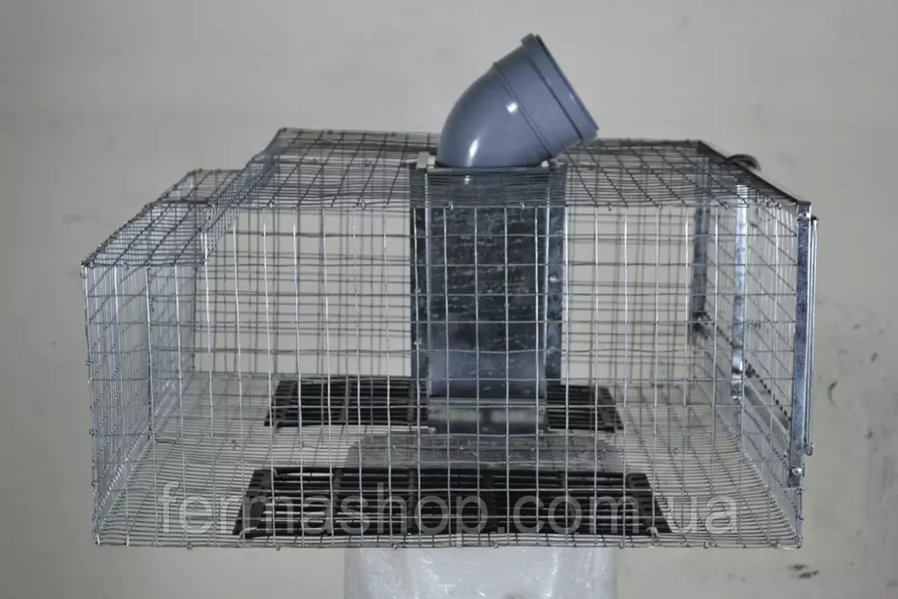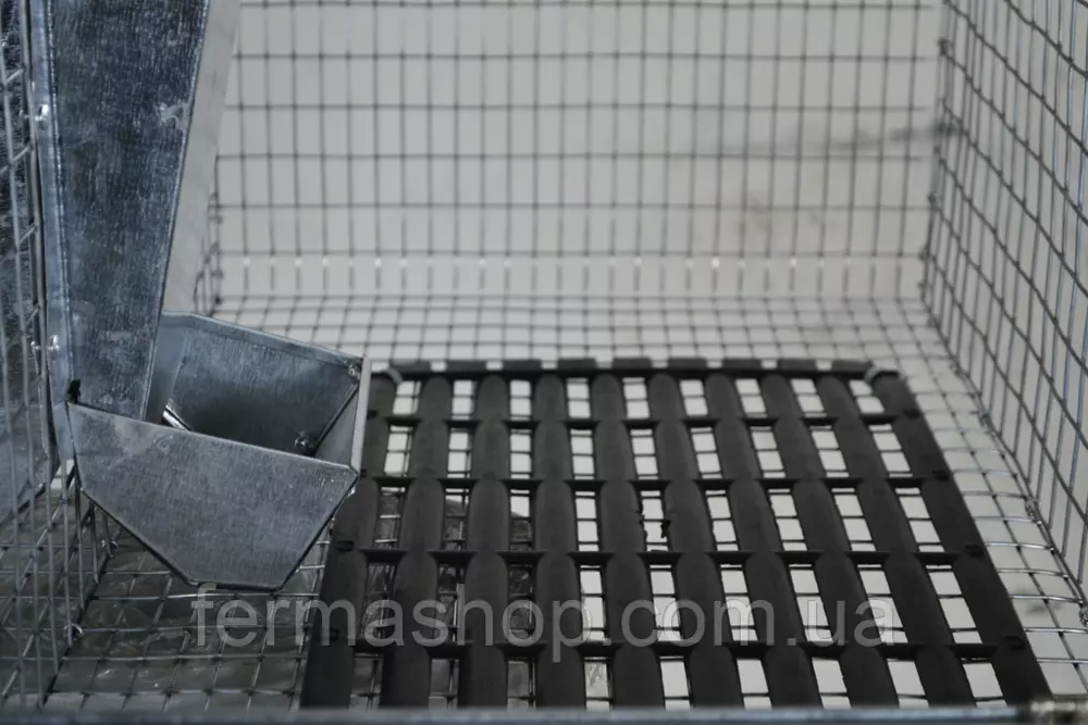 Предназначена для следующего цикла: содержание кроликов на откорме до продажи после отсадки самки. Изготовлена с проволоки толщиной 1.8 мм, размер ячейки 25х25 мм верх и боки, низ – 25х12 мм. По торцам двери обрамлены жестяным профилем для придания жёсткости и безопасности.
