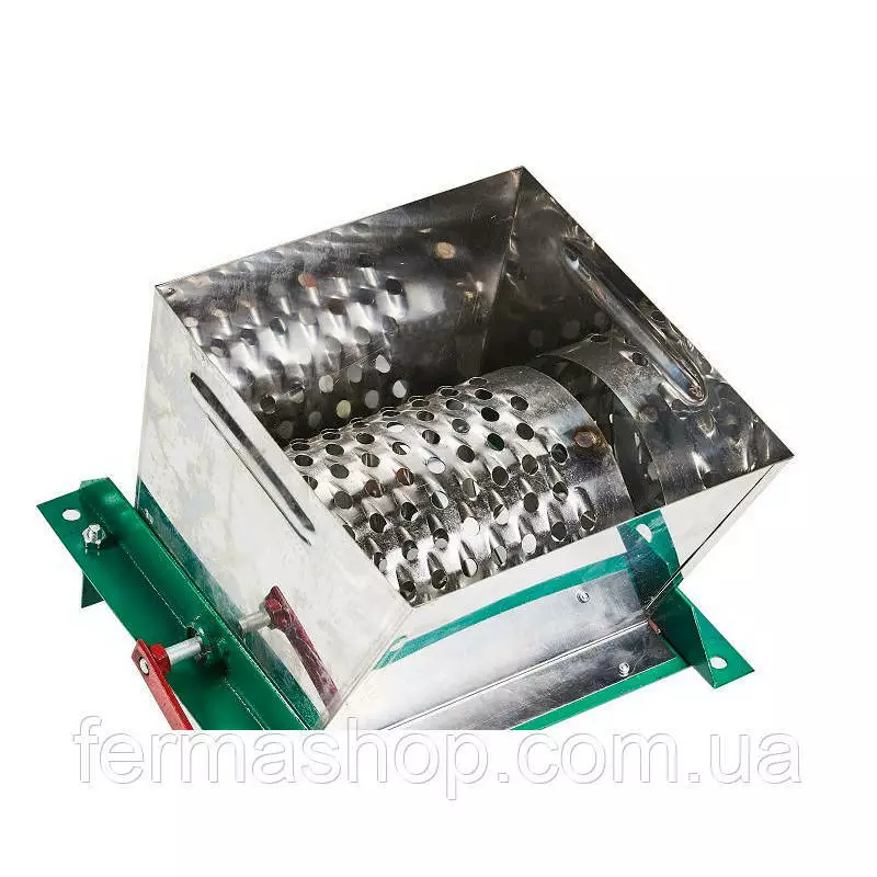 Подрібнювач для овочів і фруктів ручний з нержавіючої сталі призначений для використання в домашньому та фермерському господарстві для якісного і швидкого подрібнення коренеплодів, овочів, фруктів з метою приготування корму тваринам, домашньої птиці. Має барабанну тертку з гострими зубами. Завантаження сировини верхня, викидання подрібненої сировини проводиться з нижньої частини подрібнювача. Працює від ручного приводу, має зручну ручку.