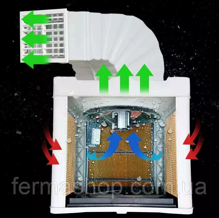 Напряжение/частота: 380 В/50Гц Поток воздуха: 25000 м³/ч Тип вентилятора: Осевой Мощность: 1,5 кВт Размеры: 1150x1150x1160мм Вес нетто: 80 кг Емкость для хранения воды: 40 литров Эффективная работа в помещении: 150 м² Материалы: Прочный и жесткий полипропилен Помогает создать среду с комфортной температурой и влажностью. Воздухоохладитель промышленной системы водяного охлаждения является ЭКОЛОГИЧНЫМ - вместо фреона и других химикатов, водяные воздухоохладители используют чистое испарение для охлаждения. Энергоэффективность: потребляет только 1/8 энергии, необходимой эквивалентным кондиционерам.Оплата та доставка
