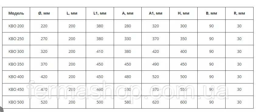 Розміри вентиляторів КВО вказані у таблиці (дивись фото)