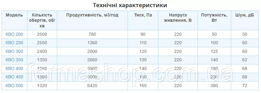 Розміри вентиляторів КВО вказані у таблиці (дивись фото)