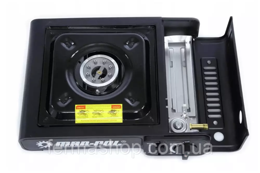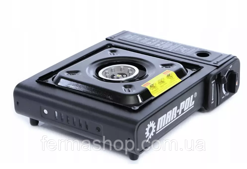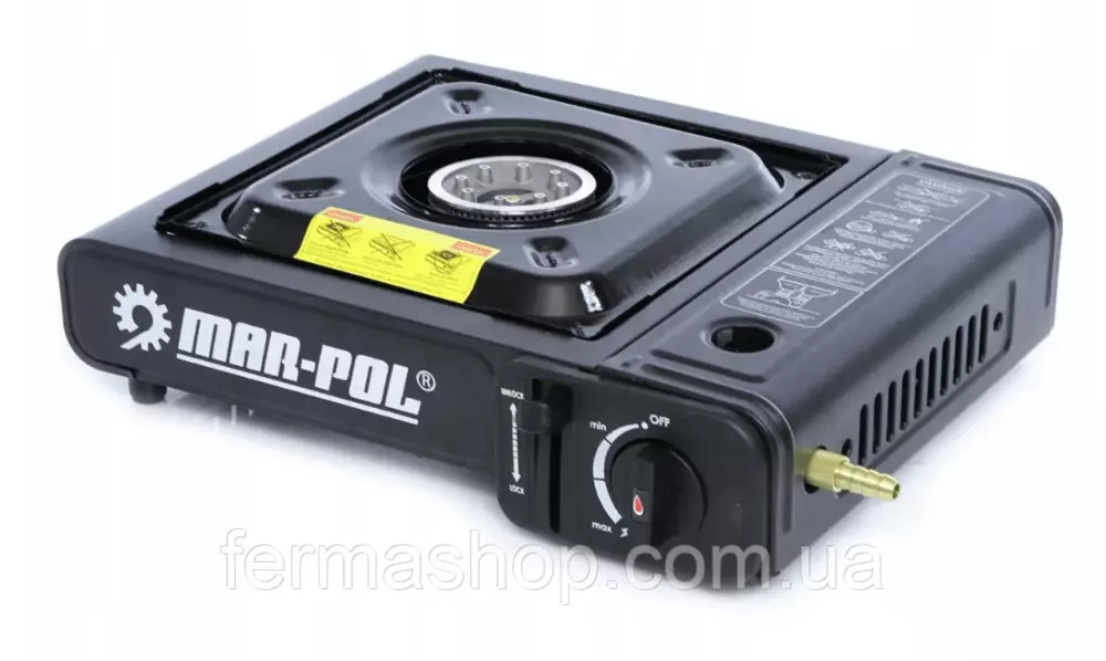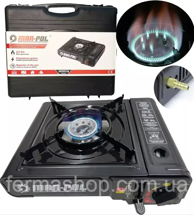 Портативна газова плита одноконфоркова з п'єзопідпалом MAR-POL M90016 працює від стандартного цангового балона на 400мл так і від великого балона, в комлпеті присутній трійник для підключення.