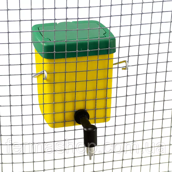 Оснащен кронштейном из металла, который позволяет крепить поилку к сетке или к клетке.