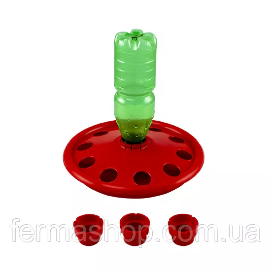 Комплект: 3 насадки с разными диаметрами, подходящими для различных типов пластиковых бутылок, сама поилка.Поилка для цыплят под бутылку.