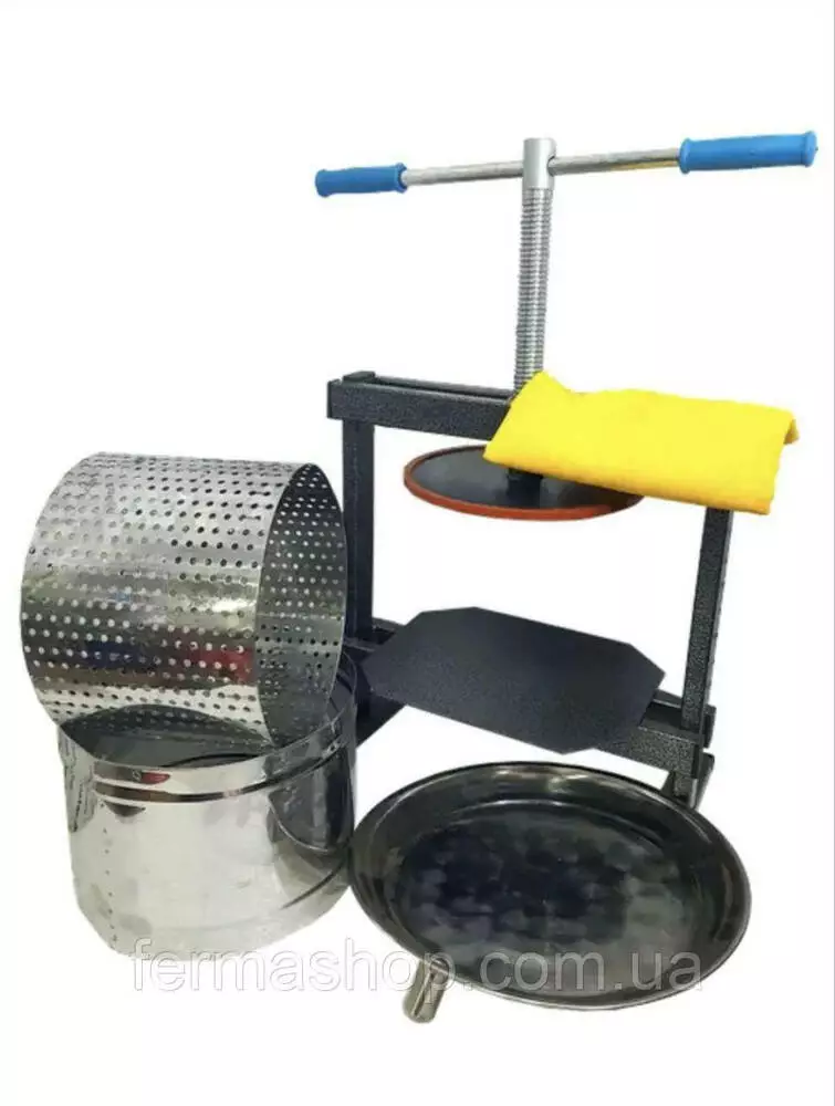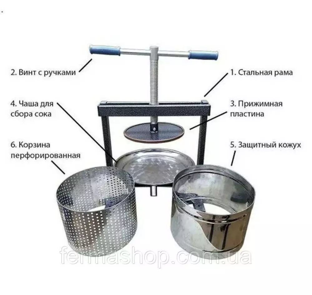 Пресс для винограда может использоваться для переработки всех видов фруктов и ягод. Позволяет отжимать сок из мягких (черника, малина, виноград) и предварительно измельченных (груши, яблоки, айва) овощей и фруктов. Также подходит для обработки творога.Прибор образован сварной рамой, перфорированной корзиной для фруктов и ягод, резьбовой группой винт-гайкой, посудой для сбора готового сока. Наличие защитного кожуха исключает разбрызгивание сока во время отжима.