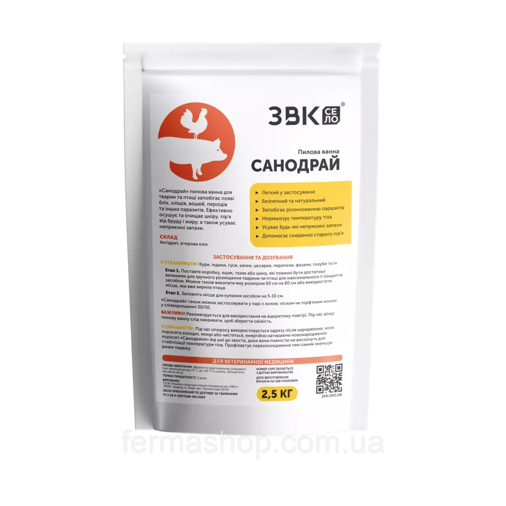 «Санодрай» помогает птице очищать перья от паразитов, таких как блохи, клещи, пероеды, клопы, вши и т.д. А также отшелушить старую кожу, сбросить старые перья, а молодое хранить чистым и здоровым. В жаркий период пылевые ванны используют для борьбы с тепловым стрессом.
