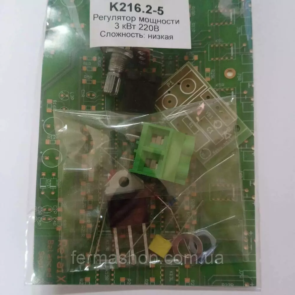 Характеристики: Рабочее напряжение: 160...300 В Максимальная мощность нагрузки: 1/5 кВт Диапазон регулировки мощности: 10-95 % Ток нагрузки: до 5/40 А Радиоконструктор M216.2-5: Предназначен для изготовления симисторного регулятора мощности, который в зависимости от используемых симисторов обеспечит мощность либо до 1 кВт, либо 5 кВт. Устройство может использоваться для регулировки мощности нагревательных, осветительных приборов, коллекторных электродвигателей переменного тока.Устройство состоит из симистора и время задающей цепочки. Принцип регулировки мощности заключается в изменения продолжительности времени открытого состояния симистора. Чем большее время симистор открыт, тем большая мощность отдается в нагрузку. А так как симистор выключается в момент когда ток протекающий через симистор равен нулю, то задавать продолжительность открытия симистора будем в пределах половины периода. В начале положительного полупериода симистор закрыт. По мере увеличения сетевого напряжения, конденсатор С1 заряжается через делитель R1, R2. Заряд конденсатора продолжается до тех пор, пока напряжение на нем не достигнет порога «пробоя» динистора (около 32 В). Динистор замкнет цепь D1, C1, D2 и откроет симистор U1. Симистор остается открытым до конца полупериода.