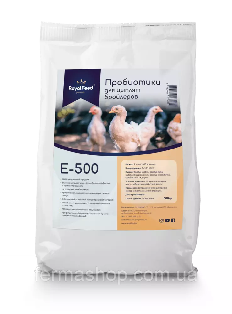 Пробиотическая кормовая добавка E-‐500, с большим содержанием Бифидобактерий, способствует формированию здоровой микрофлоры кишечника, нормальному пищеварению, выработке ферментов, витаминов и аминокислот в кишечнике, контролю кислотности среды, повышению иммунитета и активации процессов метаболизма, улучшению качества жизни и продуктивности с/х птицы.