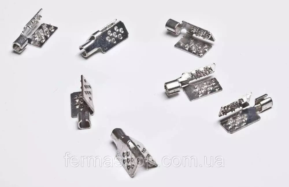 Сполучні кліпси виготовлені зі спеціального медного сплаву, ідеально підходять для організації контакту медної смуги нагрівача з електричною проволокою. Кліпси поставляються безпосередньо виробником нагрівальної плівки і тільки при їх (правильному) використанні гарантується тривалий термін роботи інфракрасного пленочного нагрівача.