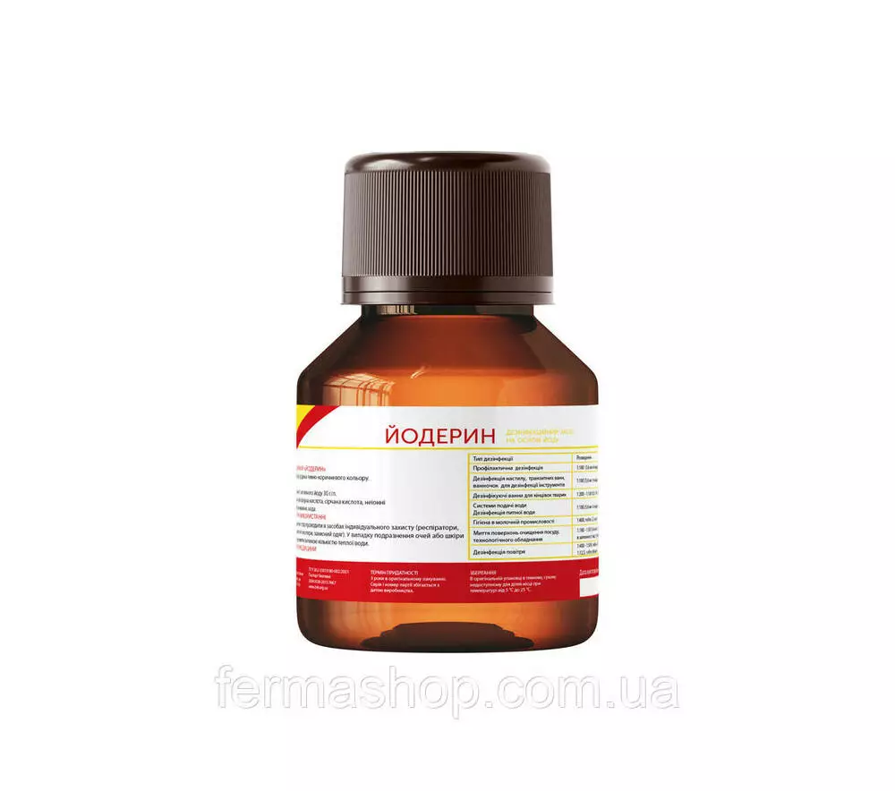 «Йодерин» эффективен при таких инфекциях, как болезнь Ньюкасла, болезнь Ауески, бешенство — из расчета 8 мл / л, везикулярной болезни поросят — 1,7 мл / л, ящур — 1,8 мл / л, туберкулез — 50 мл / л. Против PRRS или сальмонеллеза нужно использовать раствор препарата в соотношении 5,6 мл / л.