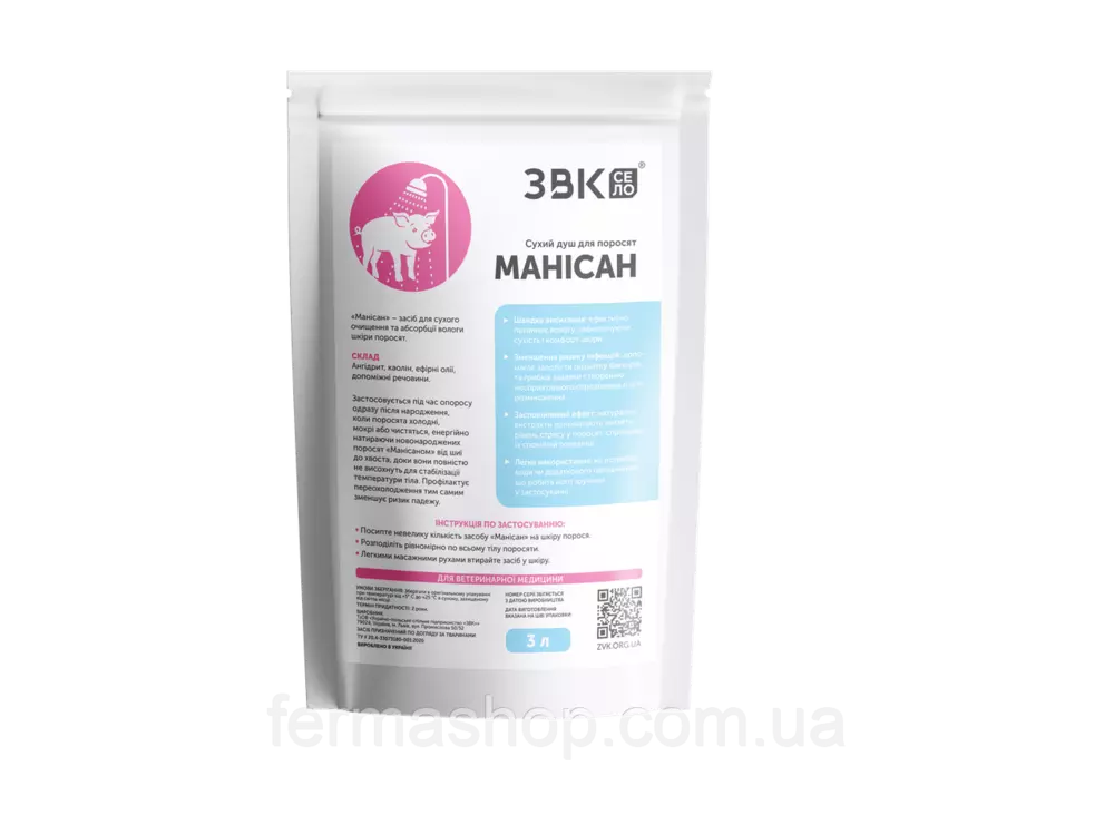 Манисан – предназначен для сухого очищения и впитывания вологи шкіри поросят. Склад: Ангидрит, каолин, эфирное масло, дополнительные речовини. Застосовується під час опоросу одразу після народження, коли поросята холодні, мокрі або чистяться, енергійно натираючи новонароджених поросят «Манісаном» від шиї до хвоста, доки вони повністю не висохнуть для стабілізації температури тіла. Профілактує переохолодження тим самим зменшує ризик падежу. Переваги використання: Швидке висихання: Ефективно поглинає вологу, забезпечуючи сухість і комфорт шкіри. Зменшення ризику інфекцій: Допомагає запобігти розвитку бактерій та грибків завдяки створенню несприятливого середовища для їх розмноження. Заспокійливий ефект: Натуральні екстракти допомагають знизити рівень стресу у поросят, сприяючи їх спокійній поведінці. Легке використання: Не потребує води чи додаткового обладнання, що робить його зручним у застосуванні. Застосування: Посипте невелику кількість засобу “Манісан” на шкіру порося Розподіліть рівномірно по всьому тілу поросяти Легкими масажними рухами втирайте засіб у шкіру. Умови зберігання: Зберігати в оригінальному упакуванні за температури від +5°С до +25°С в сухому, захищеному від світла місці. Термін придатності: 2 роки.Оплата та доставка