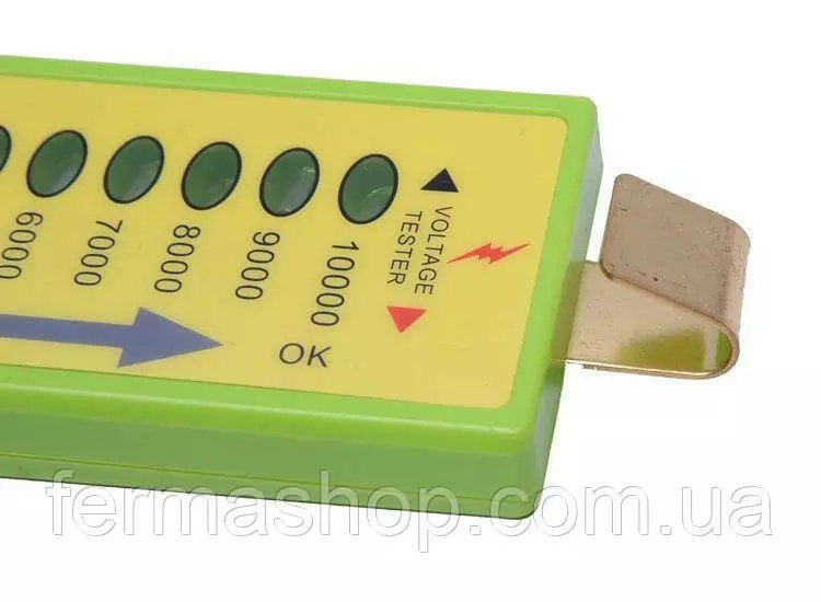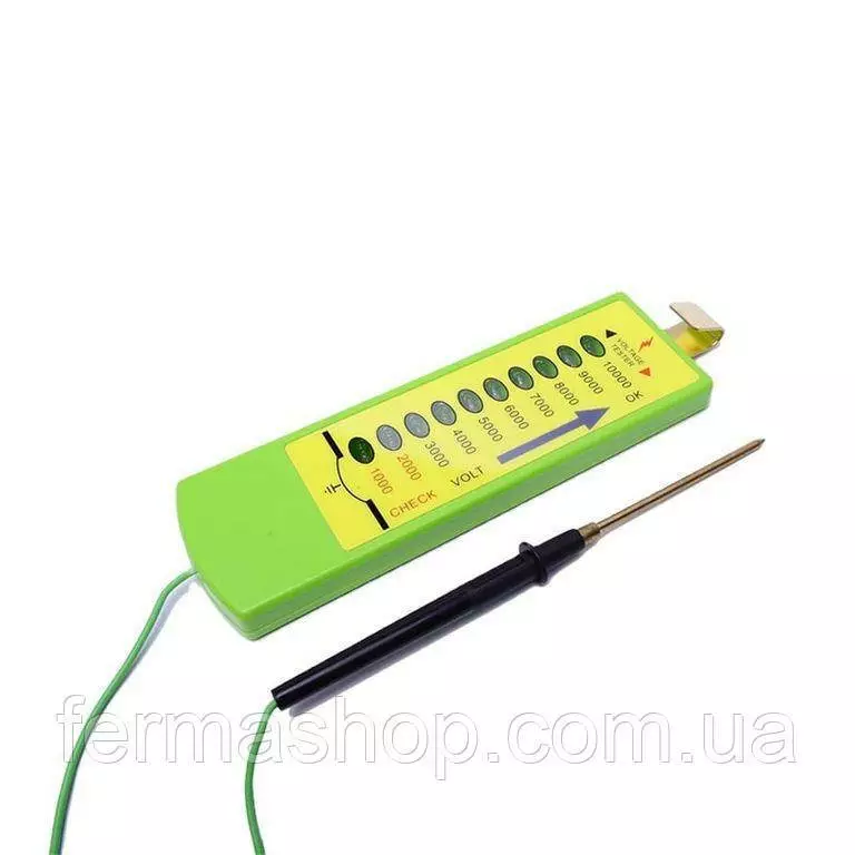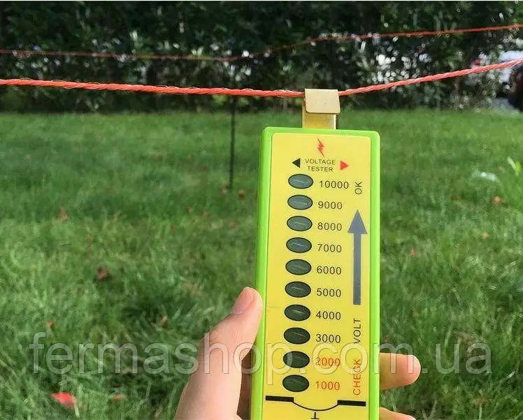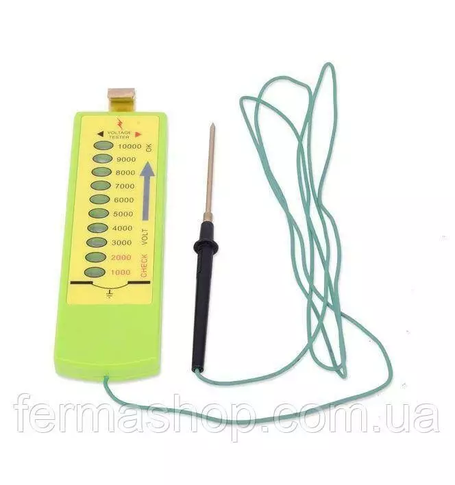 Диапазон измерений: от 1000 В - до 10000 В. Работает от разряда в сети электризатора. Работает со всеми электрическими заборами: лента, провода, веревка, канат. Корпус: АБС - пластик. Тип дисплея: Неоновая лампа. Размер: 158х50х14 мм. Вес: 80 гр. Длина провода: 136,5 см.Отображает напряжение на выходе вашего забора от 1000V до 10000V. Идеально подходит для проверки эффективной работы в разных точках огорожи. Способ применения: 1. Вставьте зонд в землю с помощью термоизолированной ручки. 2. Прикрепите(дотроньтесь) тестовым щупом к проволочной изгороди. 3. Неоновые светильники покажут напряжение. 4. Если лампы не светятся, разъемы могут быть не замкнутые(земля - провод), или забор иметь проблемы. 5. Снимите тестовый щуп от забора и пробник от земли.
