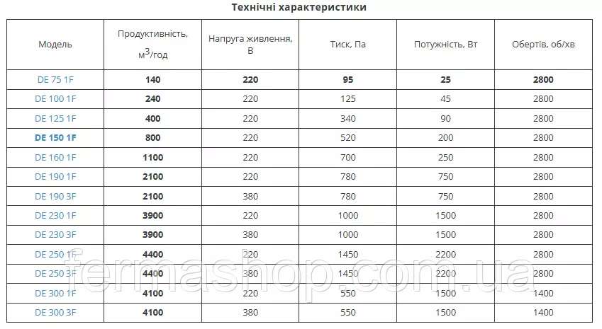 В таблиці на фото можна ознайомитися з характеристиками всього асортиментного ряду відцентрових промислових вентиляторів Turbo DE.
