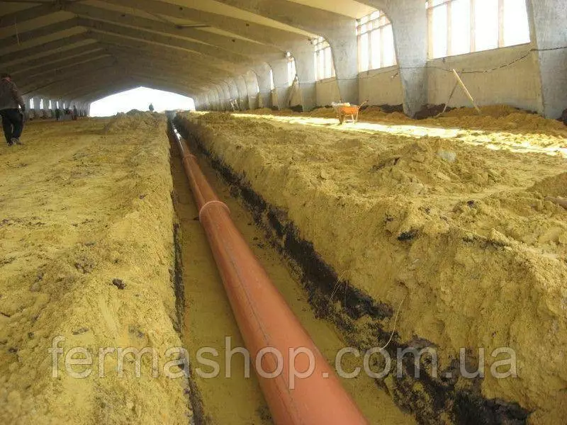 Система навозоудаления монтируется из специально изготовленных ПВХ - седел, а также стандартных ПВХ труб и фитингов для наружной канализации