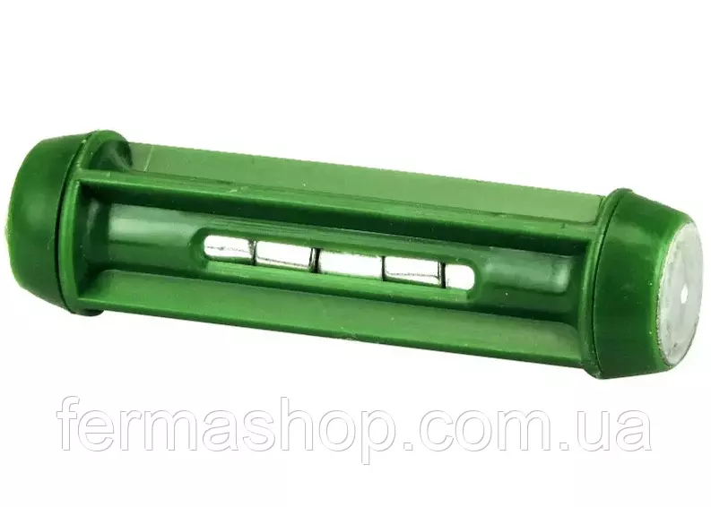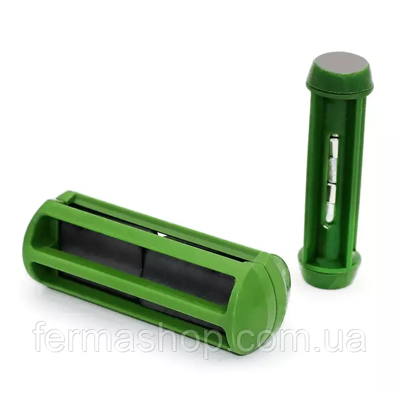 Магнитная ловушка изготовлена из пластмассового короба зеленого цвета со встроенным в него мощным магнитом. Ее габариты составляю 20 мм в диаметре и 85 мм в длину. Такие размеры позволяют водить ее внутрь животного и притягивать небольшие металлические элементы, находящиеся в сетке. Устройство довольно мобильное и может использоваться как для лечения, так и для профилактики.